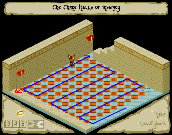 First, go straight down and pick up the potion. Come back up to the square you started on, and move straight right. When the elephante is trapped go around to the front of the 4 "tables" and to the right. You should have a ring saved from earlier levels, if you followed my walkthrough. If so, use it to sneak past the right guard and grab that ring, then quickly back out.