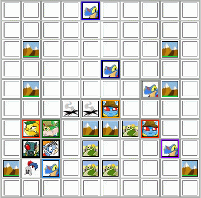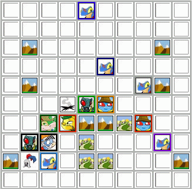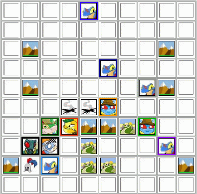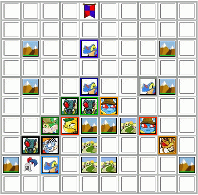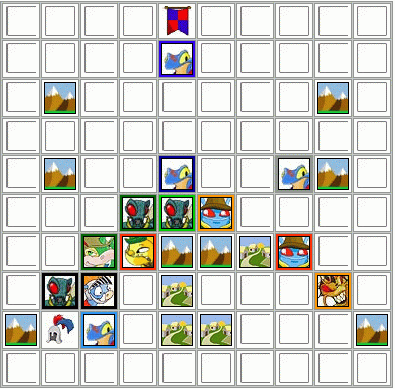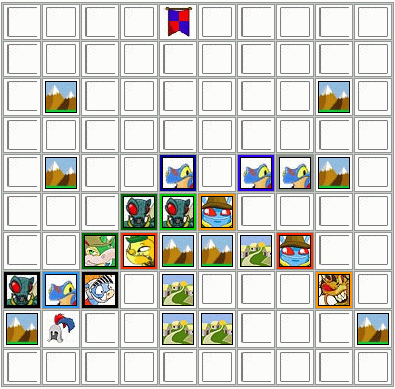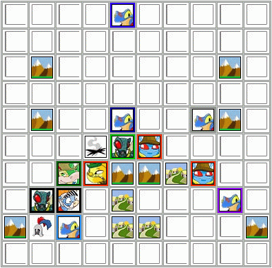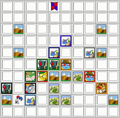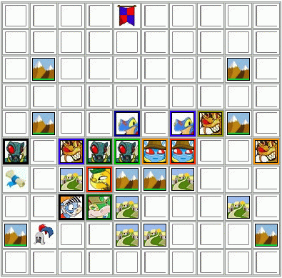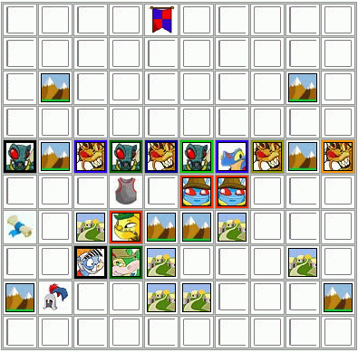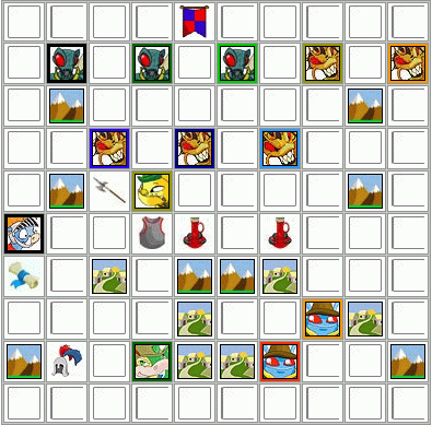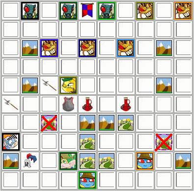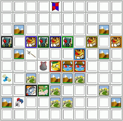 The Playing Grid measures 10 by 10 squares. Some of the squares will be taken by items, some by players, and some by non-passable objects. To move your troops, first select one by clicking on it once, then click on the square you wish to move to. Remember, you can move in any direction, but only one space at a time (unless you are a skeith using a teleport amulet), so if you click on a square that is out of range, nothing will happen. You cannot pass mountains, or villages, so clicking on those will not get you very far :) If you move on a square with an item, the item will automatically be used by your soldier. Clicking on a square with an enemy present, (if you are in range 1 space away) will make your soldier attack the enemy. If you have a Grundo equipped with a Magic Spell of Force you may click on any of your own soldiers to heal them, but only if the soldier has an available move