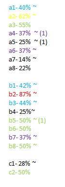 NOTE: SOME SPACES HAVE 0%. THIS DOES NOT MEAN IT WILL ABSOLUTELY NEVER BE A HIT. IT MEANS THAT IT WAS NEVER A HIT IN THE 10 GAMES I USED FOR THE STATISTICS.