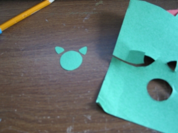 Cut down the line you drew. These are the ear stalks. When you glue them to the head, make sure that they, like the ears, are glued from behind. And also make sure to have the ear stalks facing opposite each other and outwards. It may look funny if you don't. Finish off the ear stalks by gluing two slightly pointy oval shapes to the top of each one. Glue the oval on top of the stalk, not behind. Now that your head is finished, you can use the pen to draw in the facial/ear features.