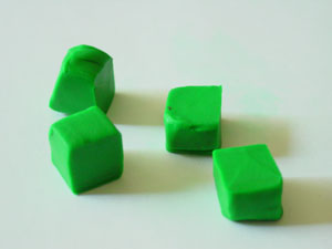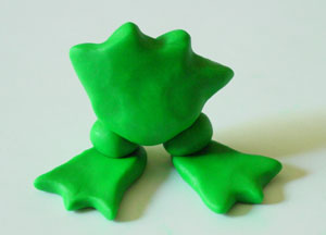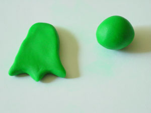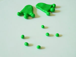 Cut the remaining green clay into 4 approximately equal pieces. Two will be used for the feet, one for the knees, and one for the toes.