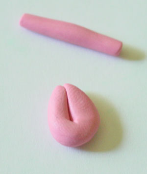 Mix some of the red clay with some white to make a bright pink. Take a piece of the clay about the same size as used on the eyeball, and roll it into a cylinder. Then make the cylinder into a U shape and flatten it slightly. Use a toothpick to push the center part down into the bottom of the mouth.