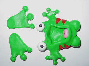 Use the final block of green clay from step 3. Pull off little bits of clay and roll them into balls that will become the toes. The ones for the feet will be larger than those for the hands. Smooth them to the bottoms of the feet and back of the hands the way you did with the legs in step 6.