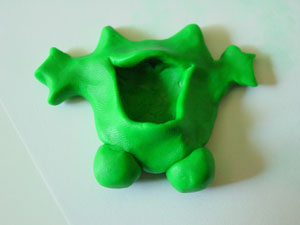 This is by far the most difficult part. Don't get too concerned at making the mouth perfect right away, because you WILL mess it up in the next few steps. Just shape out the general shape of the mouth, using fingers, toothpicks, whatever. Look at the happy Quiggle image on Neopets and shape the mouth more or less like that. Remember the mouth takes up most of the body. In this image I have also started to form the hands and fingers, much the same as the feet were made in step 4.
