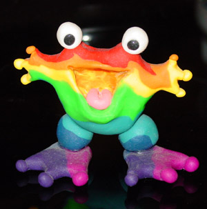 After the clay has fully cooled, glue the legs to the feet. Once the glue has dried fully, paint the eyes with the clear nail polish, or other shiny clear paint. Voila! Your very own polymer clay Quiggle!!!